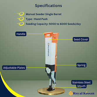 The Royal Kissan Adjustable Agricultural Handpush Manual Seeder is an essential field tool that simplifies and speeds up seed sowing. Designed for farmers and gardeners, it allows you to plant seeds accurately with consistent spacing and depth for improved germination and uniform crop stands.