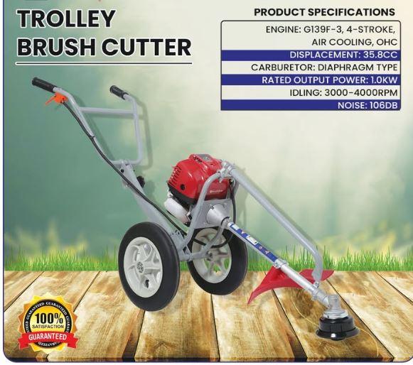 Heavy-duty 4-stroke petrol hand grass cutter designed for fast and efficient grass, brush, and farmland clearing. Comes with durable brush wheels for rough terrain.